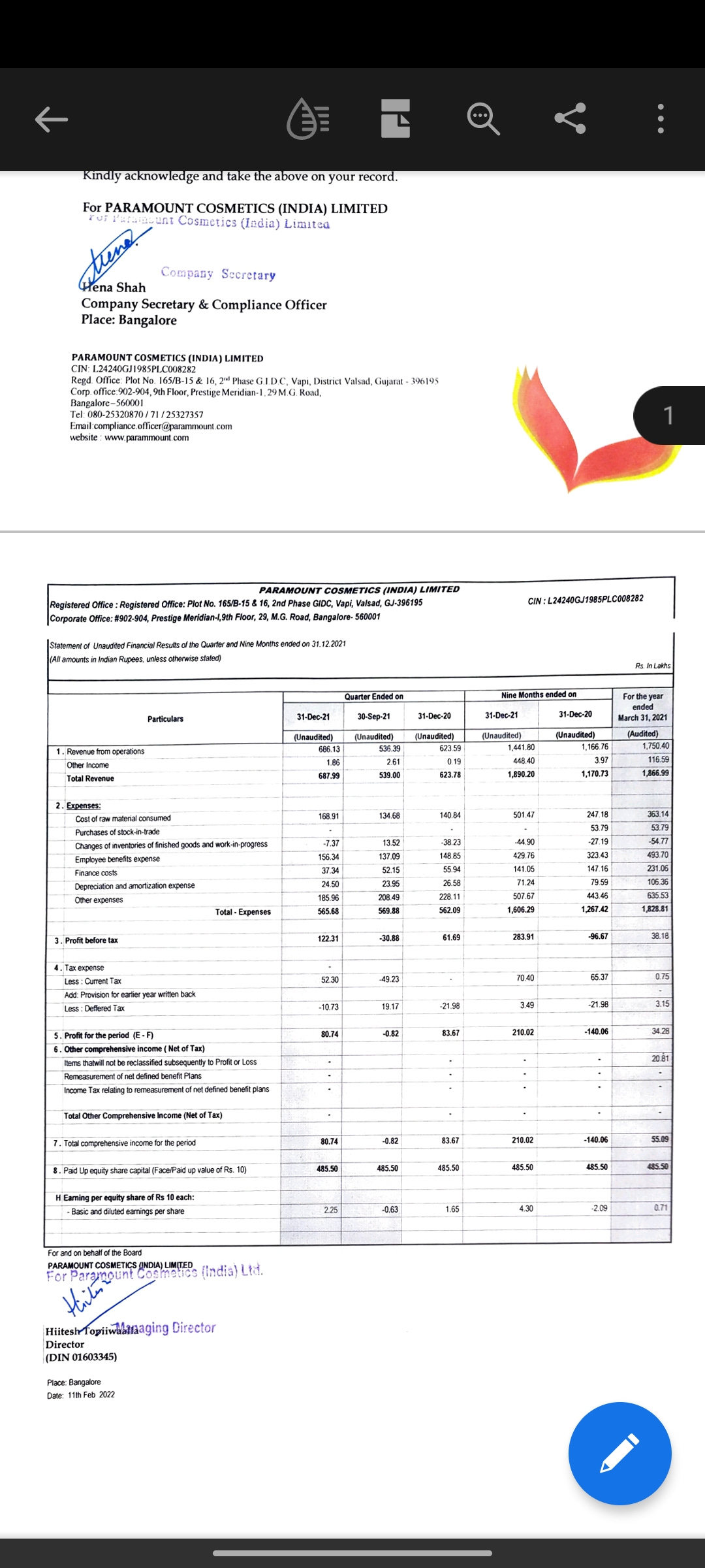 Paramount Cosmetic (market cap 20 cr) : Years of languishing results from this company which owns the famous Shilpa bindi. This quarter shows sign of some improvement but need to watch for few quarters-